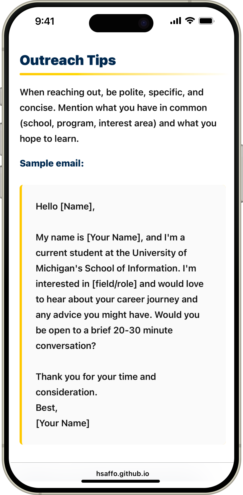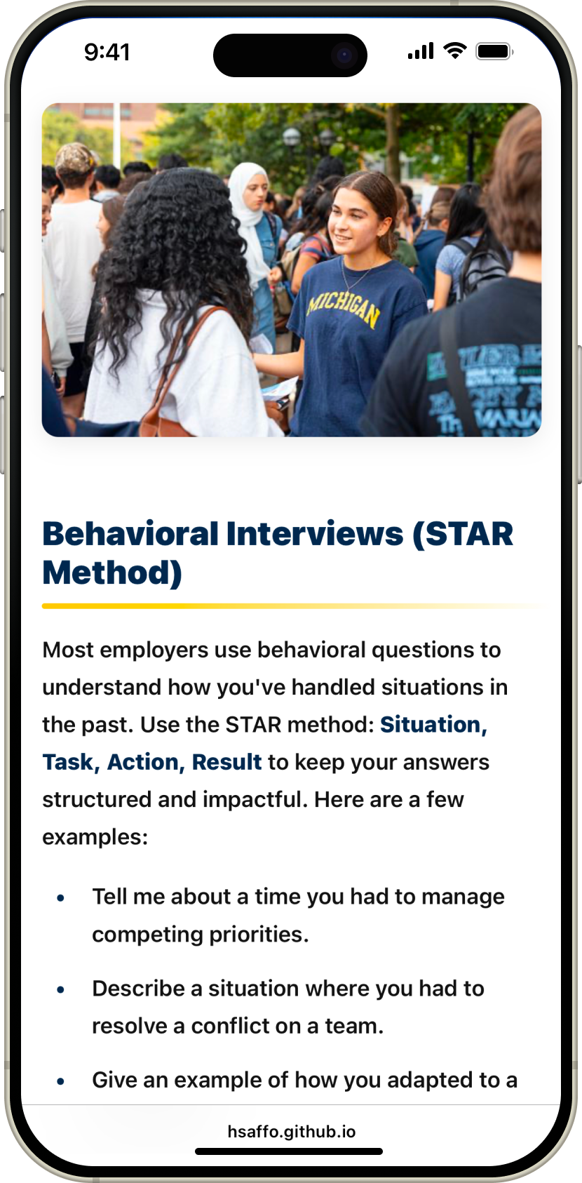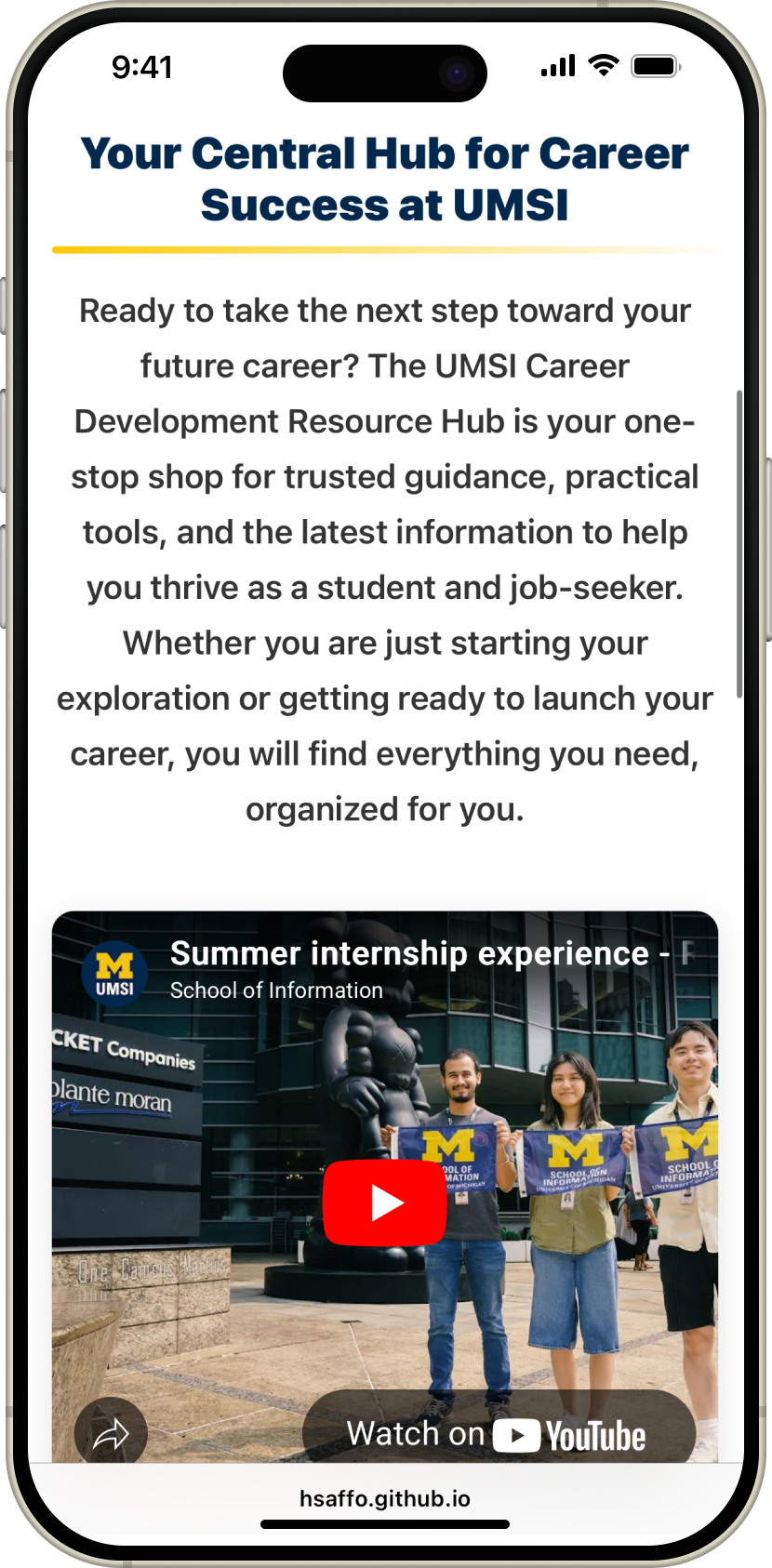 Academic course project to independently design a mobile-first career resource website for the UMSI Career Development Office, focused on accessibility and clear resource discovery.